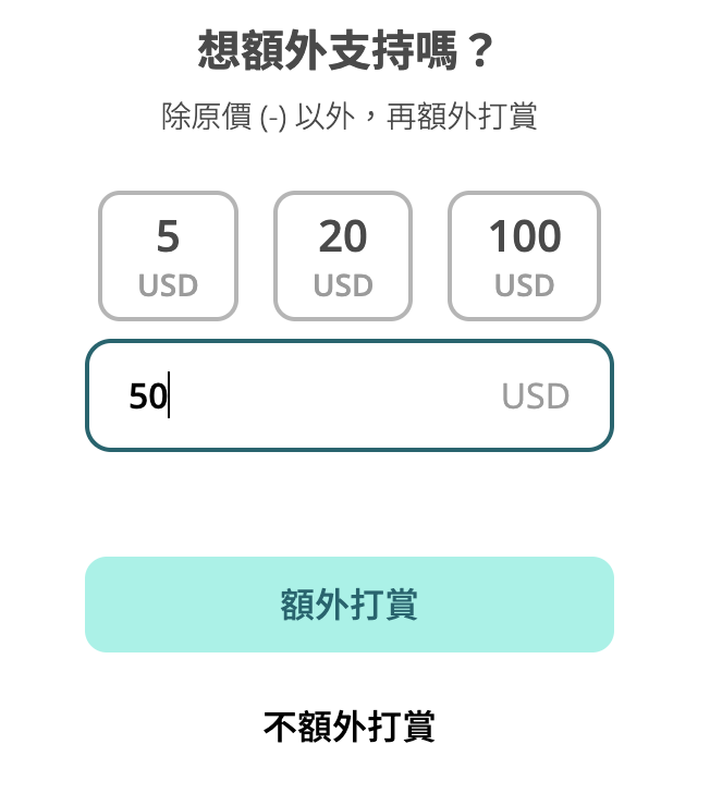 除了付原價購買以上兩份刊物以外,現在更可以額外打賞自訂金額,進一步支持作者。試試看吧!