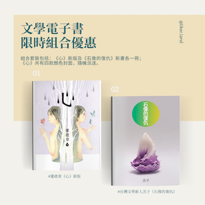 同時購買《心》和《石像的復仇》NFT 電子書,可享八八折優惠。經獨立書店購買優惠套裝,也可同時獲得《心》的贈品好禮,萬勿錯過!