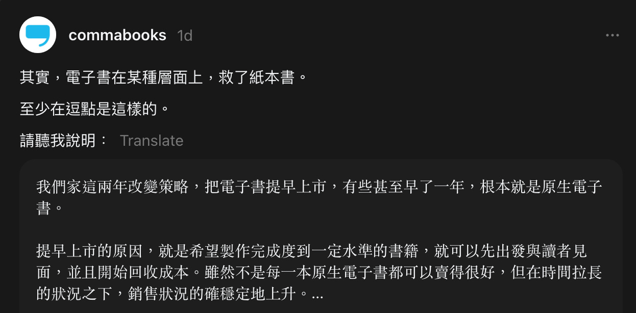因為在這個模式之下,我才有辦法拿電子書的收益來補紙本書的成本,把定價壓下來。逗點文創結社 Threads 帖文