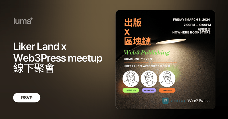 Liker Land 將於台北舉辦 2024 第一場線下交流聚會,在飛地分享出版 X 區塊鏈 X 書店的實驗!歡迎舊雨新知來碰面。不單適合非技術人士參加,也歡迎技術高手到場交流,因為 Liker Land 的核心開發者也會到場呢。