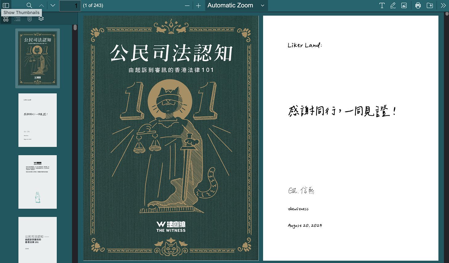 這幾年,多虧《法庭線》和一眾堅守崗位的媒體的努力,令持續在香港法庭上發生的事情保持公眾熱度,也為這段歷史留下不可磨滅的證據。這本書的主題雖是法律科普,但從各樣的細節中讀者都能看到珍貴的時代記錄,從每隻字中都能感受那份擇善固執。在電子書的扉頁,你會見到創辦人的簽名和留言: