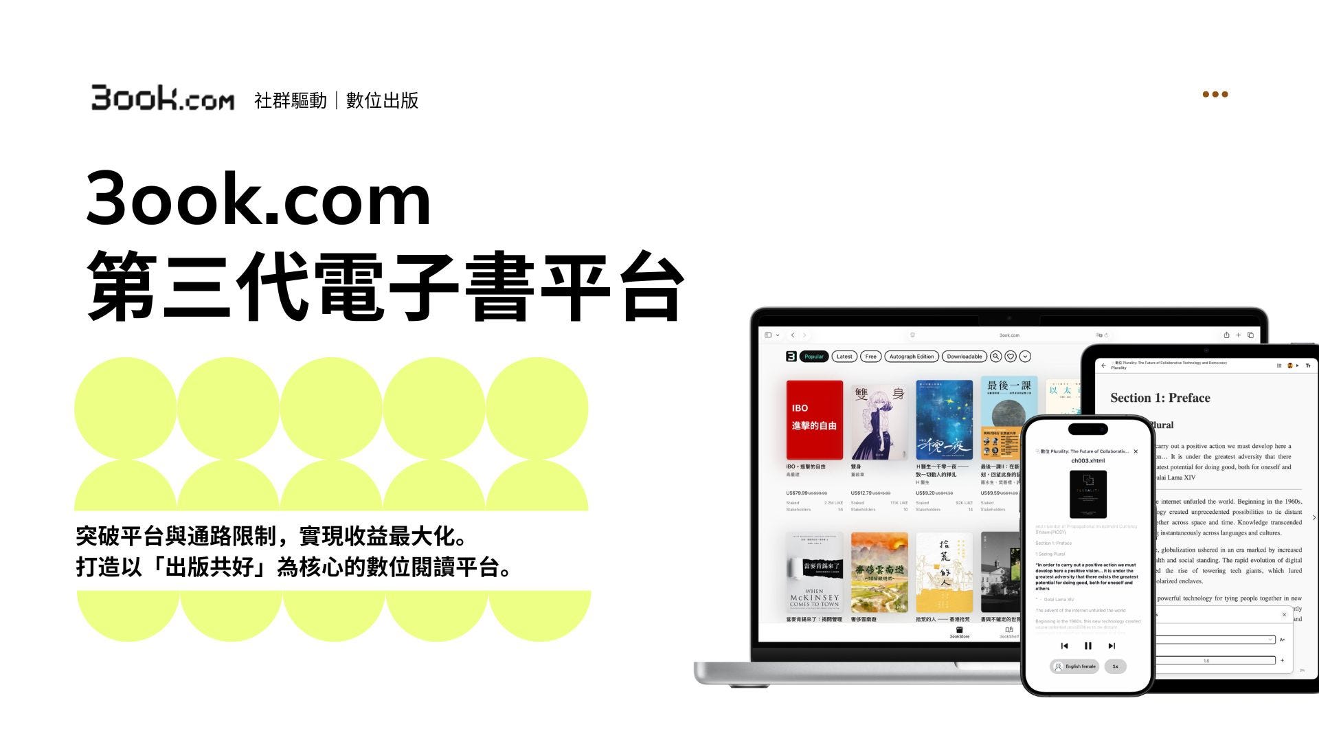 3ook.com 第3代電子書店,可讀、可聽、可擁有。滙聚讀者、作者與書店,共同策展、發布與銷售多元書籍及刊物,運用 AI 及 Web3,保育文化,守護歷史。