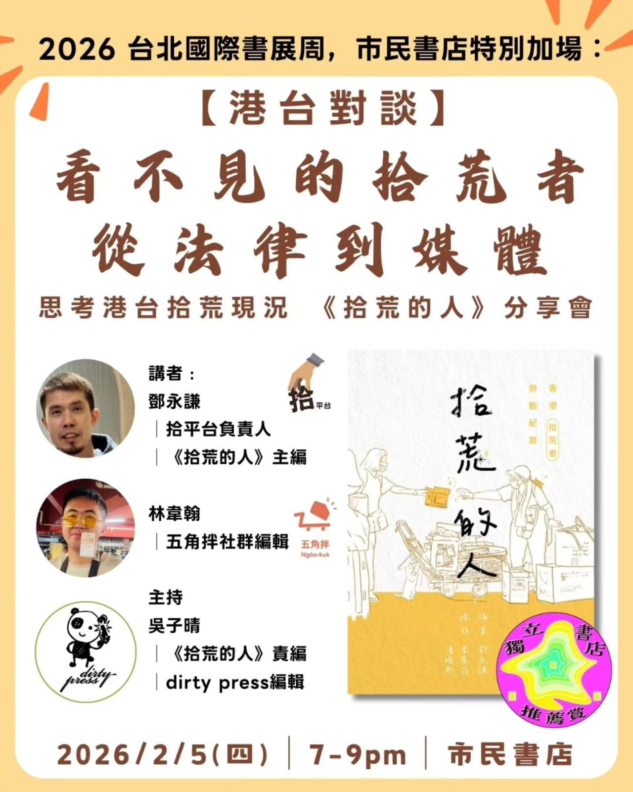《拾荒的人——香港拾荒者勞動紀實》榮獲第一屆獨立書店推薦賞,非虛構類組別亞軍,及獲讀者票選為「全民我最喜愛書籍」。讀過以後,當在街上再見到拾荒者的身影時,你會見到不一樣的風景。創作團隊現正在台北國際書展擺攤,2 月 5 日會有一場講座活動,台北的朋友不要錯過啊。